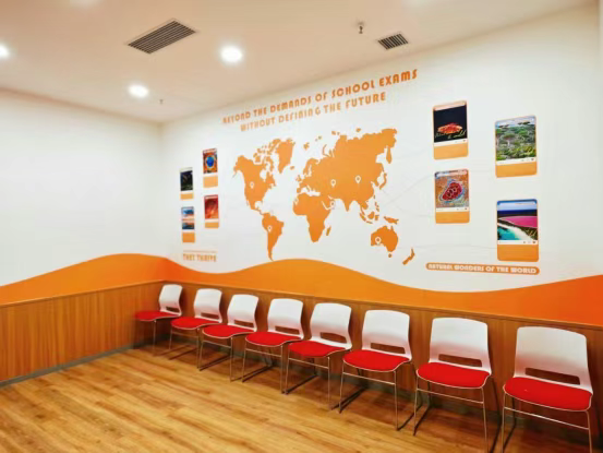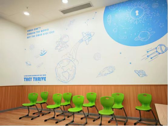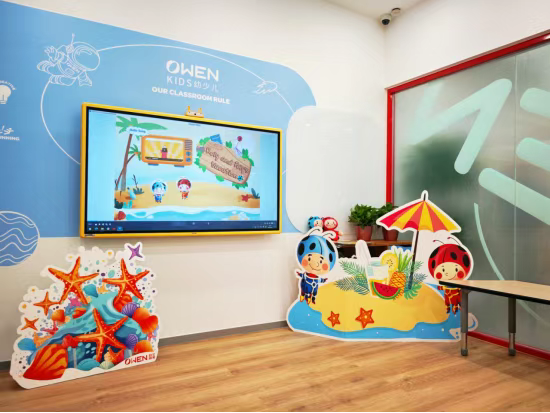 校区以“探索未来·自然共生”为主题,巧妙融合探索主题与欧文特色的英语环境风格。室内设计突破传统教室格局,引入开放式教学区、项目式学习工坊及互动区域。课程方面,延续欧文自研Roly Poly体系与AI智慧学堂技术,引导学员结合周边自然环境探访和本土资源,实现语言学习与综合素养的深度融合。